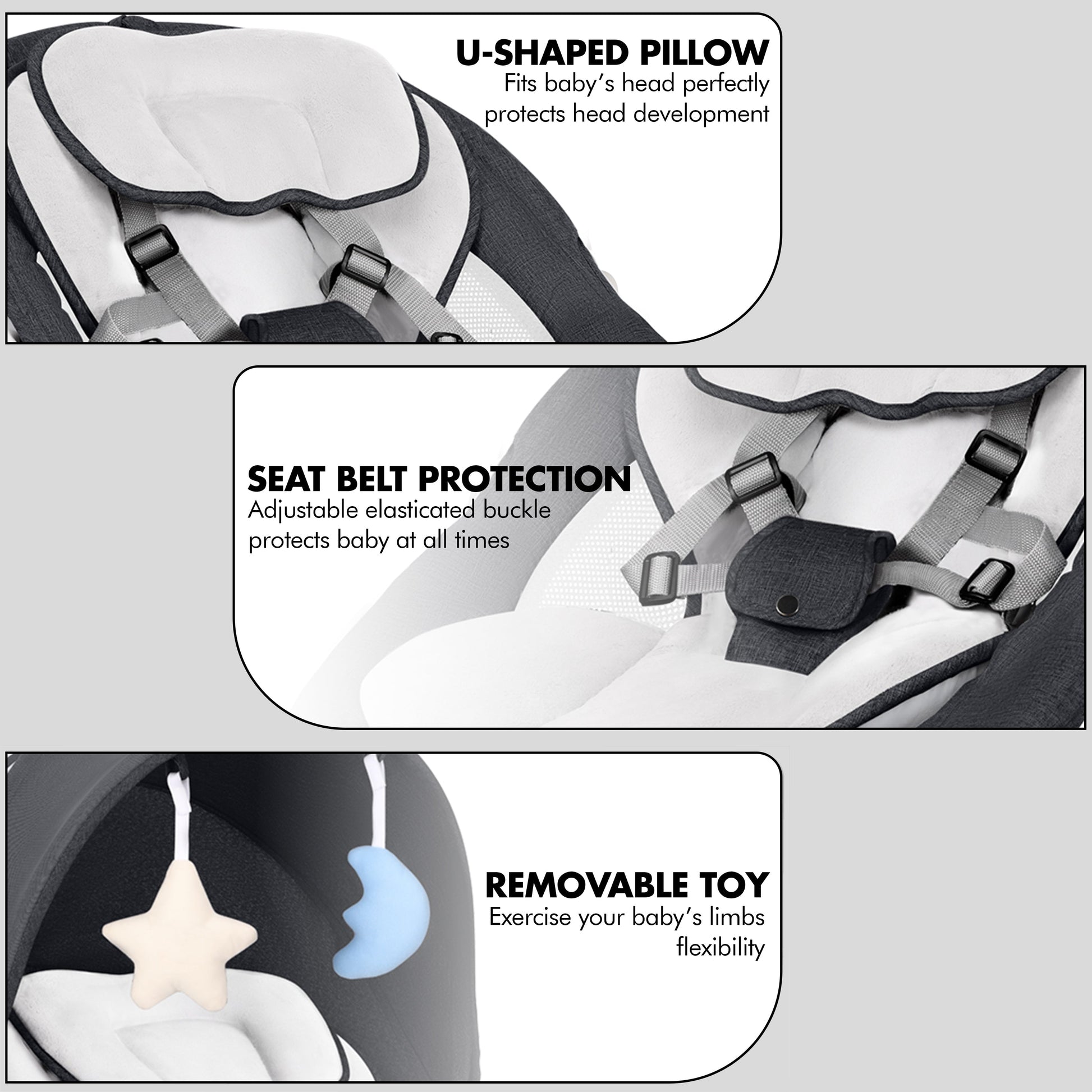 8. Removable Toys and Safety Belt: Features a detachable toy to enhance your baby’s physical flexibility and a safety belt for secure and comfortable support.