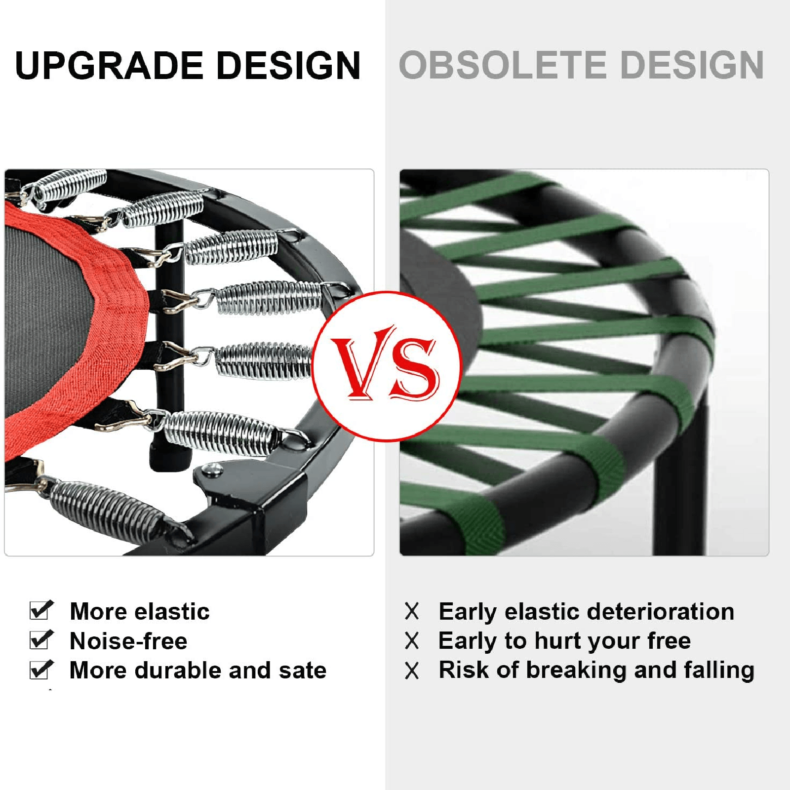Whether you're short on space or want a reliable piece of fitness equipment at home, this mini trampoline is designed with advanced safety features, quality materials, and a compact, foldable structure that allows for easy storage in closets, under beds, or in car trunks.