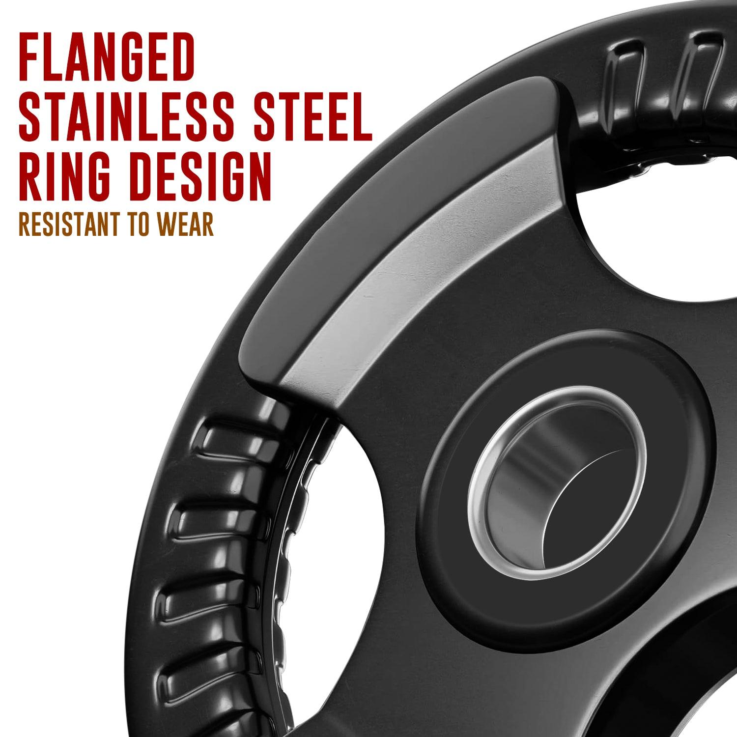 Each weight plate is derived from heavy-duty iron with a solid, high-grade, low-bounce rubber cover surrounding the parameter. This helps alleviates damage to flooring, equipment, and injury to oneself